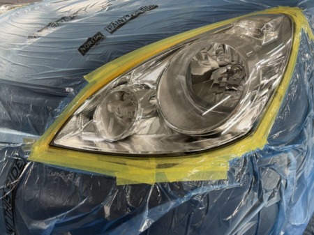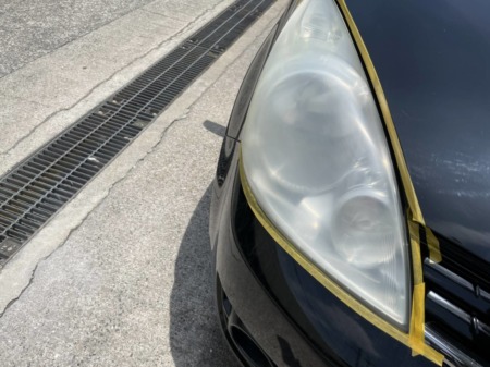 ▼ まず、ヘッドライト周囲をマスキングテープを貼って、塗装面などに傷がつかないようにします。