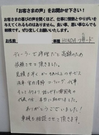 堺市の板金塗装修理をしたお客様からのご感想(ホンダ・フリード)