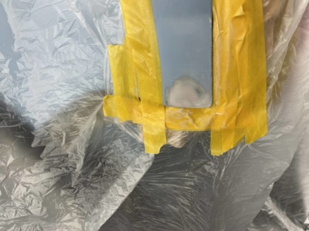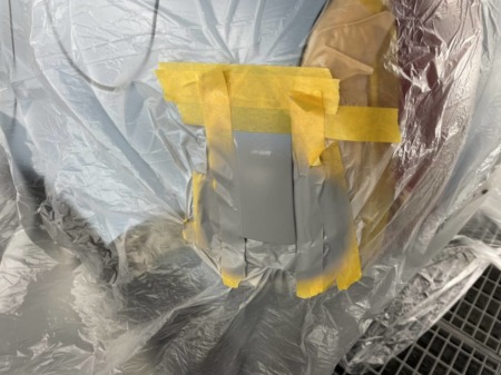 ▼ サフェーサを塗布しますがその際には塗料がかかってはまずい個所を専用のシートでマスキングをしてからサフェーサを塗布します。