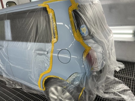 ▼ これからクオーターパネルの塗装に入りますがその前にマスキングを丁寧に行ってから塗装をします。