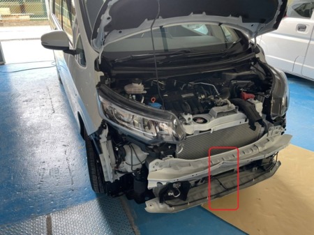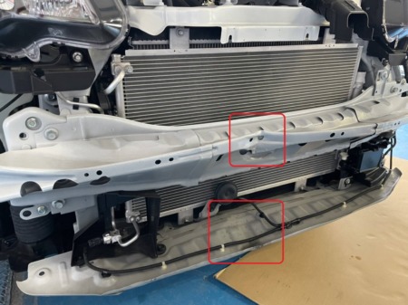 ▼フロントバンパーを取り外し、内部を確認すると、骨格にまで影響が及んでいました。