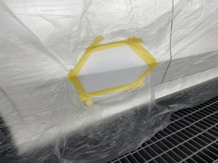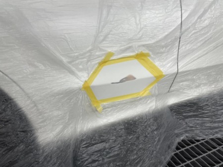 ▼次に下地処理剤のサフェーサーを吹き付けるため、周辺をマスキングします。