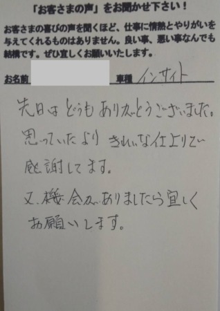 クリア剥がれ補修塗装をしたお客様からのご感想(堺市西区 ホンダ・インサイト)