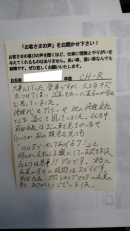 堺市西区より鈑金塗装修理をしたお客様からの感想(トヨタ・CHR)