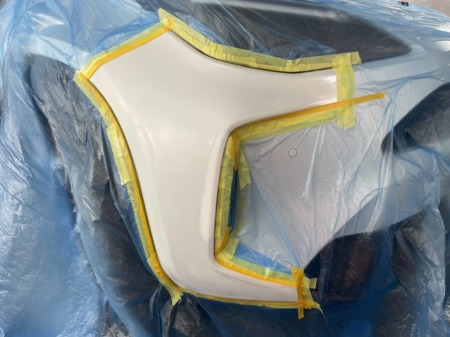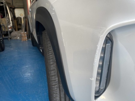 ▼ フロントバンパーの傷を細かいサンドペーパーで削ってパテを薄く塗り、研磨を数回繰り返して滑らかに仕上げた状態になります。