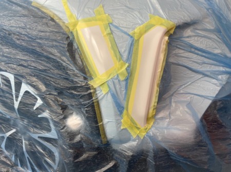 ▼ 傷周辺に塗装前の下地処理のためのサフェーサを塗布します。