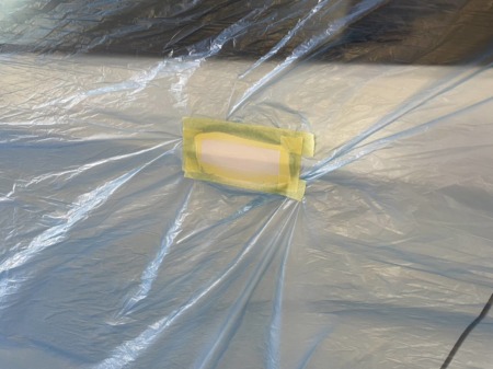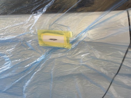 塗装の前に塗料がかかってはまずい個所を専用のビニールシートでマスキングを施します。