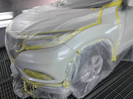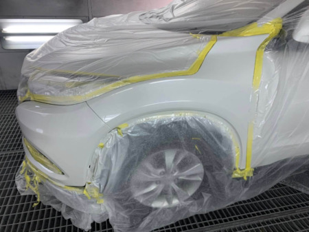 塗料は当社で色合わせ(調色)をします。お車のカラーコードを確認して調合し、実車と見比べながら微調整を繰り返し、色がピッタリ合うようにします。