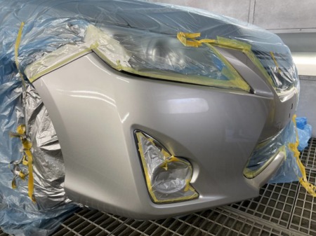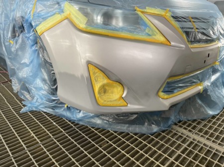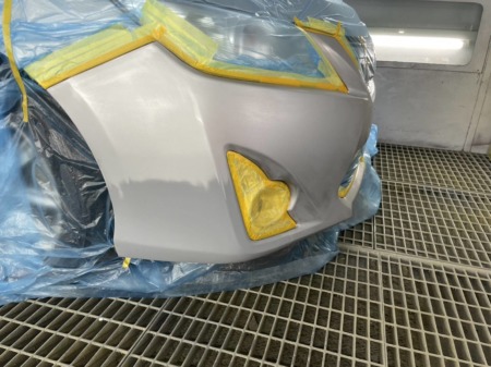 ▼フロントバンパーの塗装箇所以外には塗料が入り込まないよう、しっかりとマスキングをしておきます。同様に脱脂しておきます。