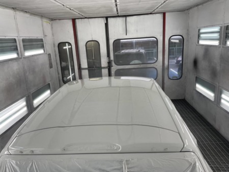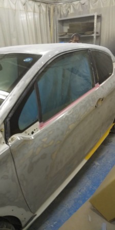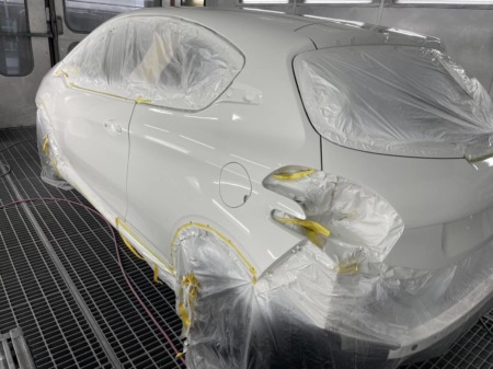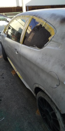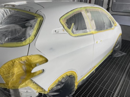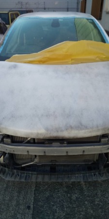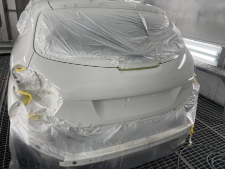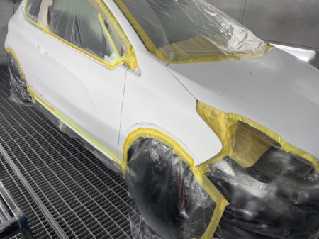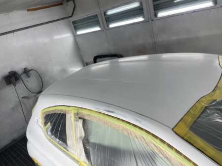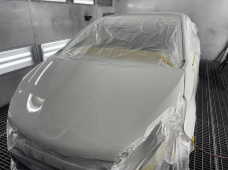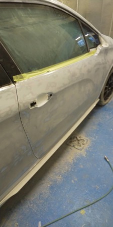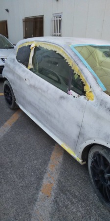▼ガラス部分を養生し、サフェーサーを吹き付けます。