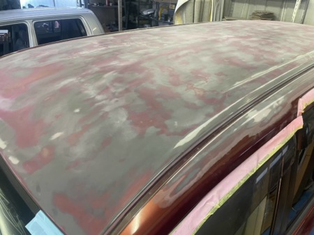 ▼ ルーフの塗装を完全に剥がしたらサンドペーパーで全体を平滑に整える処置をお行います。
