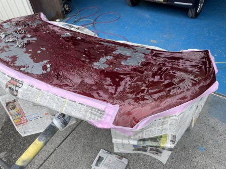 ▼ ボンネットフードも一旦車体から取り外して剥離剤を塗布し、同様に塗膜を剥がしていきます。