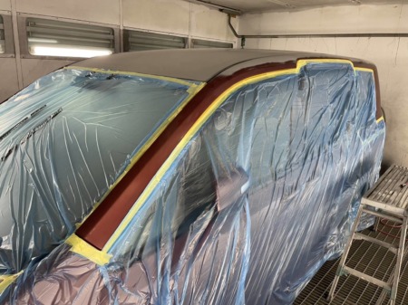 ▼ サイドウインドウやフロントガラスなどに塗料がかかってはいけないのでビニールシートでマスキングをします。