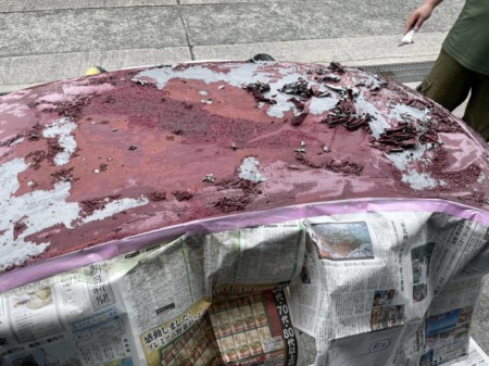 ▼ 特殊剥離剤を全面に塗布し、しばらくすると塗膜が剥がれて浮き上がってきます。そこをスクレパーなどの工具を使って、塗料を完全に剥離して、鉄板の素地にします。