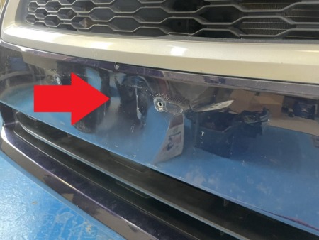 ▼ フロントバンパーは大きく内側に凹んでいたので新品と取り換えます。
