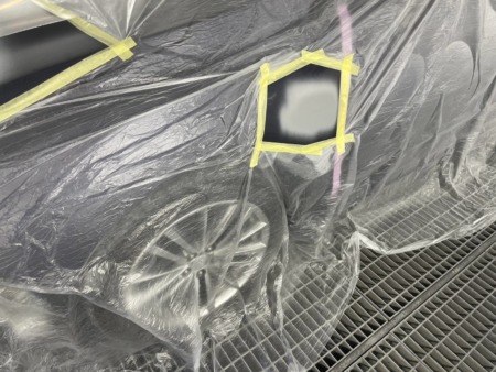 塗装面以外の塗料がかかってはまずい個所を専用のビニールシートでマスキングをしてから塗装を開始します。