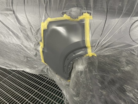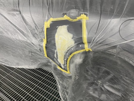 ▼次に周囲を養生し、下地処理剤のサフェーサーを吹き付けます。