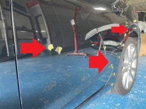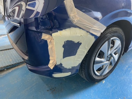 ▼周囲を養生し、パテが乾いたらペーパーで研いで形を整えます。