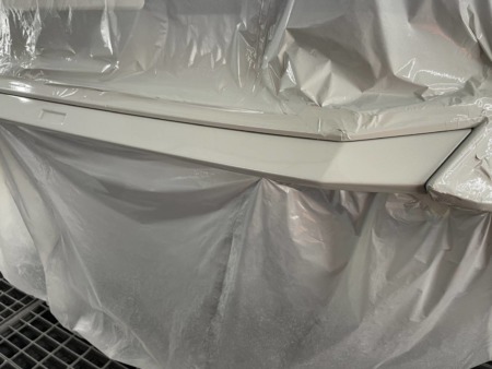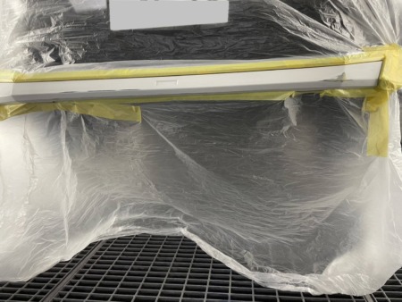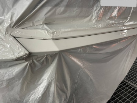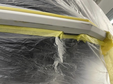 ▼パテ作業が終わったら、周辺を養生して、下地処理剤のサフェーサーを吹き付けます。