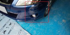 ▼ バンパーのひっかき傷はさほど大きくなかったので細かいサンドペーパーでキズ部分を削って滑らかにします。