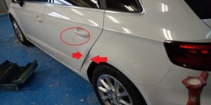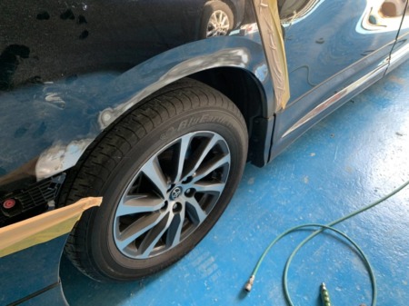 ▼ まず、クオーターパネルの擦り傷部分をサンドペーパーできれいに均し、パテ成型による凹凸を埋めて平らにし、パテを砥いで平滑に仕上げていきます。