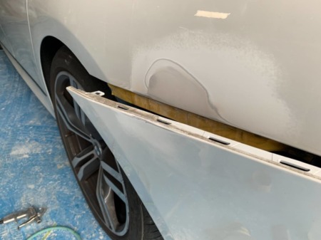 ▼クォーターは凹みの修正も行い、同じくパテを塗って成型します。