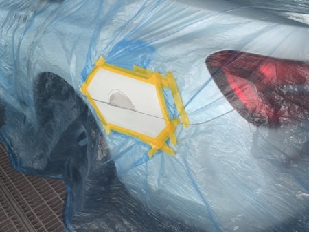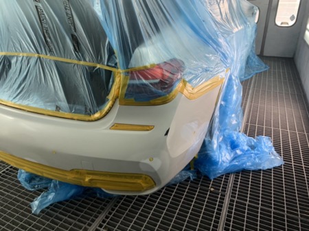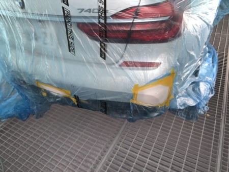 ▼次に下地処理剤のサフェーサーを吹き付けるために周辺をマスキングします。