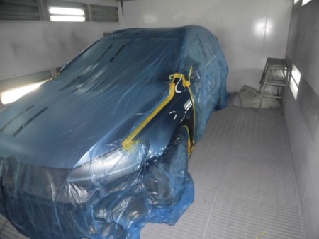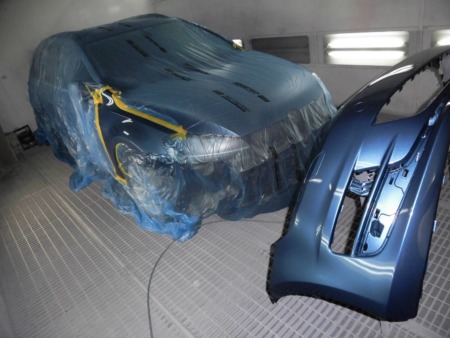 フロントバンパーからフェンダー、それに加えてボンネットとの色の差が出ないようフェンダーパネル内でうまくぼかして塗装します。