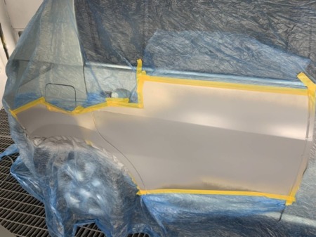 ▼ クオーターパネルとリアドアにサフェーサが塗布された状況になります。