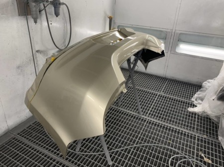 ▼ 塗装は塗装専用ブースで行われますがその前に当社の職人により現車の色に合わせた塗料の調色を行ってベースカラーを決めて塗装を行います。