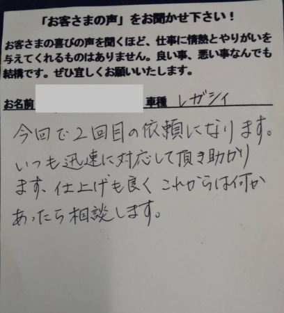 堺市中区より鈑金修理をしたお客様からの感想のご紹介(スバル・レガシィ)