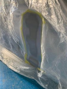 深めに削った箇所には粘土状のパテを塗ります。(黄色の部分)